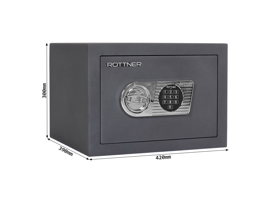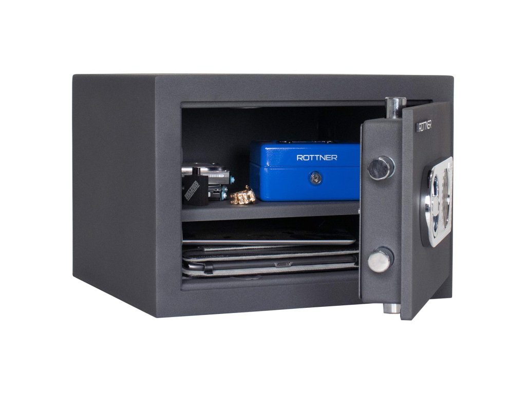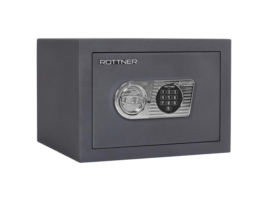 Hlavní výhody: Certifikovaný elektronický zámek Bezpečnostní třída I (ČSN EN 1143-1) Možnost nastavení 2 kódů, hlavní a vedlejší (tzv. master a user kód) Automatické zablokování trezoru na určitý čas po nesprávném 3. zadání hesla Trezor má dvouplášťové dveře s tloušťkou 12 mm Napájení 1 x 9V baterií (není součástí balení) Dveře trezoru lze otevřít v úhlu 90° Rozvorový uzamykací mechanizmus zajistí uzamčení na 3 stranách Dodávané s 1 vyjímatelnou poličkou Otvory na ukotvení na spodní a zadní straně trezoru Menší trezor z modelové rodiny Rottner Toscana nabízí bezpečnostní třídu I a certifikovaný elektronický zámek. Zámek je napájen klasickou 9V baterií, přičemž v případě vybití baterie stačí koupit novou, přiložit ji z vnější strany na určené kontakty a trezor můžete otevřít. Výhodou trezoru je možnost zadání 2 kódů a to hlavního a vedlejšího. Trezor je tak možné použít i v hotelových zařízeních. Uvnitř najdete jednu vyjímatelnou poličku, kterou jednoduše rozvrhnete prostor v trezory. Trezor můžete namontovat na podlahu nebo i na zadní stěnu, a to díky předpřipraveným otvorem. Kotvící materiál je součástí balení.Doplňkové parametry