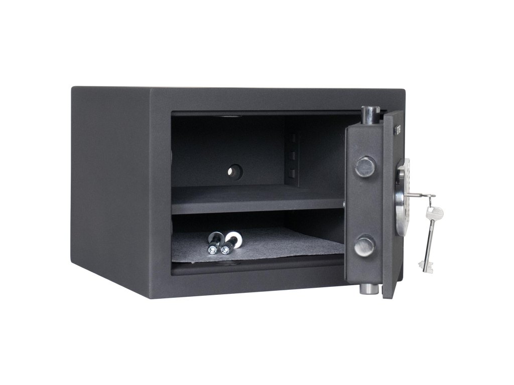 Hlavní výhody: Certifikovaný trezorový zámek s 2 klíči Bezpečnostní třída I (ČSN EN 1143-1) Trezor má dvouplášťové dveře s tloušťkou 12 mm Dveře trezoru lze otevřít v úhlu 90° Rozvorový uzamykací mechanizmus zajistí uzamčení na 3 stranách. Dodávané s 1 vyjímatelnou poličkou Otvory na ukotvení na spodní a zadní straně trezoru Dvouplášťový nábytkový trezor nabízí zabezpečení uložených cenností zamykáním na trezorový zámek a je držitelem bezpečnostní třídy I (ČSN EN 1143-1). Uzamčení zabezpečuje 3-stranný mechanismus, aby všechny uložené cennosti, drobnosti nebo cestovní doklady byly v bezpečí. Vnitřek je vybaveno vyjímatelnou poličkou, která umožní rozvržení vnitřního prostoru. Trezor můžete ukotvit na spodní i zadní straně. Kotvící materiál je součástí dodávky. Kování zámku zvyšuje celkovou vnější hloubku trezoru o 15 mm.Doplňkové parametry