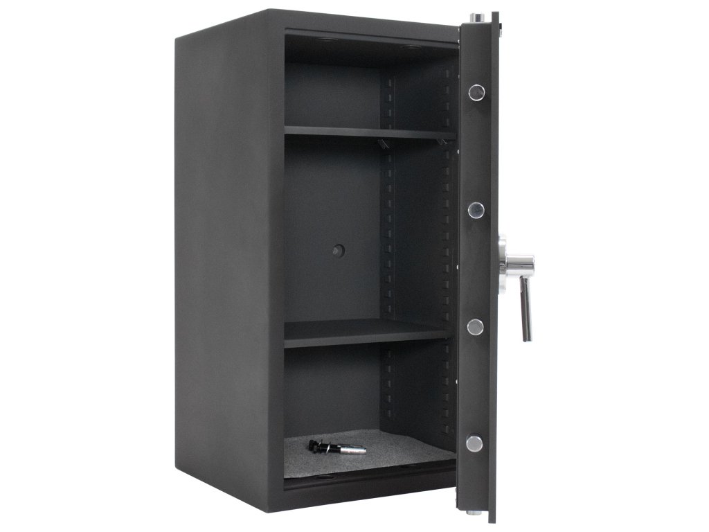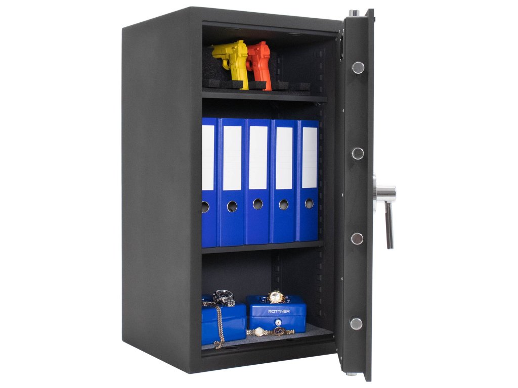 Hlavní výhody: Certifikovaný elektronický zámek Bezpečnostní třída I (ČSN EN 1143-1) Napájení 1 x 9V baterií (není součástí dodávky) Trezor má dvouplášťové dveře s tloušťkou 12 mm Dveře trezoru lze otevřít v úhlu 90° 3-stranný uzamykací mechanizmus 2 vyjímatelné poličky Elektronické nouzové otevírání externí baterií a vnějšími kontakty Otvory na ukotvení na spodní a zadní straně trezoru Prostorově největší trezor z modelové řady Toscana nabízí variabilní prostor i díky 2 nastavitelným poličkám a dostatečné výši. Všechny uložené cennosti, jakož i šanony nebo dokonce menší kasička budou spolehlivě ochráněny díky kvalitnímu elektronickému zámku a bezpečnostní třídě I (ČSN EN 1143-1). O napájení zámku se postará 9V baterie. Dvouplášťové dveře s tloušťkou 12 mm je možné otevřít až v úhlu 90°. Připraveno otvory na spodní a zadní straně trezoru skvěle poslouží k ukotvení. Kotvící materiál je součástí dodávky. Kování zámku zvyšuje celkovou vnější hloubku trezoru o 60 mm.Doplňkové parametry