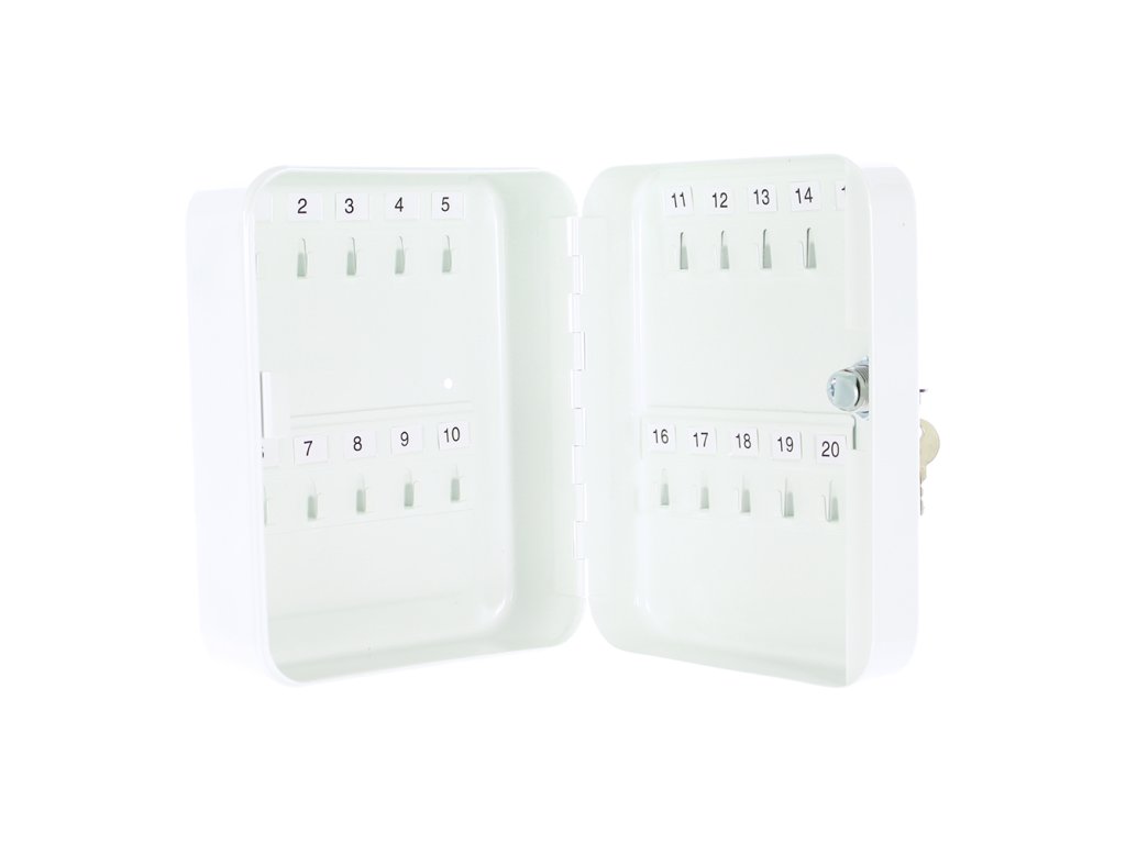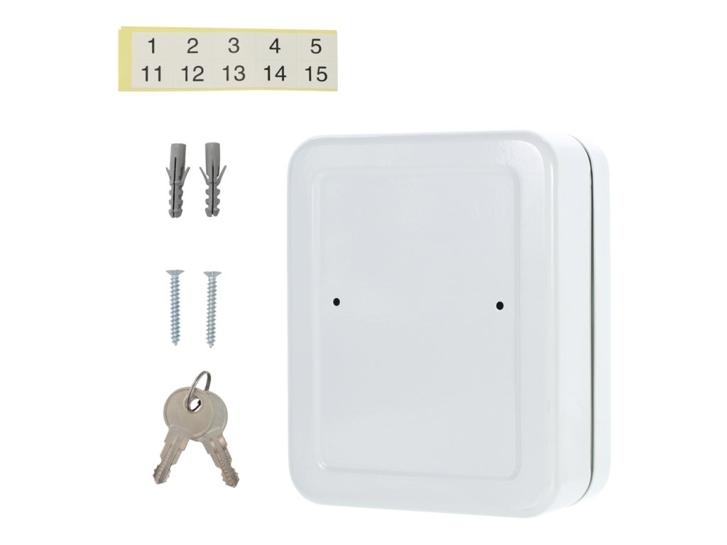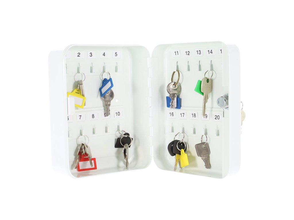 Hlavní výhody: Cylindrický zámek s 2 klíči Prostor pro 20 klíčů Fixne umístěné háčky na lištách Kvalitní ocel Jednoduchá ale funkční ocelová skříňka na klíče vám pomůže udžet pořádek a přehled mezi všemi klíči. Obzvlášť se hodí pro provozy, kde je často třeba mít přehled v klíčích a rychle je umět najít. Na pevně namontované háčky můžete pověsit 20 klíčů přičemž jednotlivé háčky jsou očíslovány pro lepší přehled. Zároveň v balení naleznete potřebný kotvící materiál pro připevnění na stěnu.Doplňkové parametry