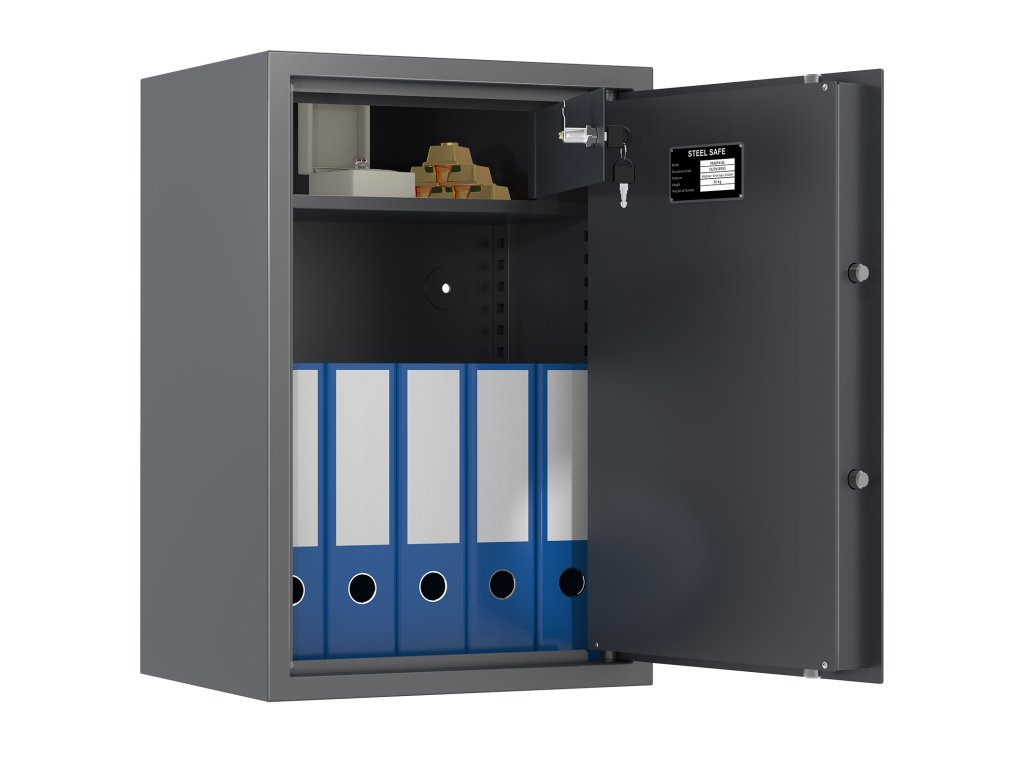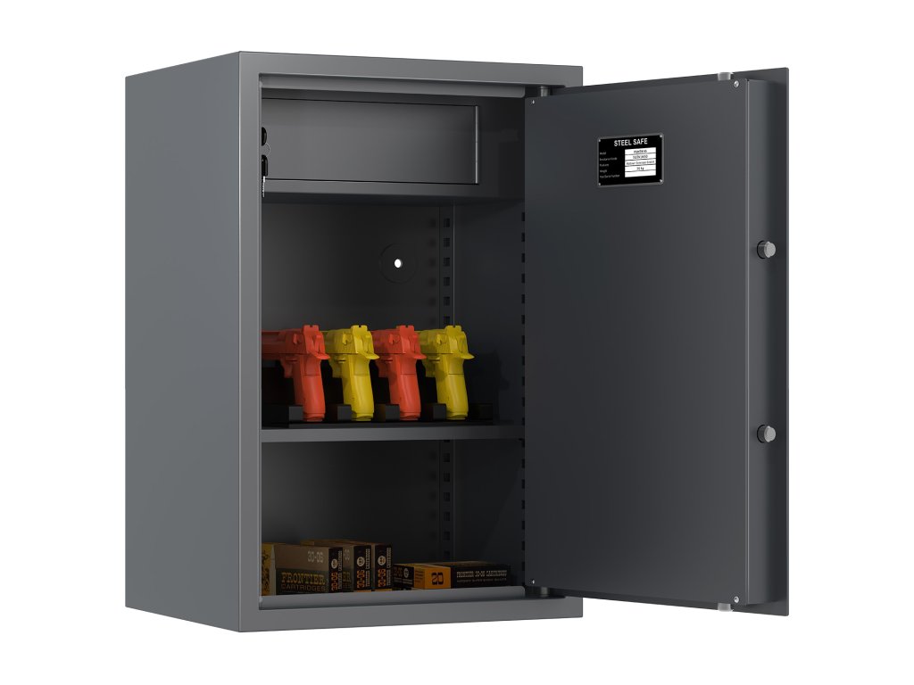 Certifikovaný trezorový zámek třídy A podle ČSN EN 1300 Bezpečnostní třída S1 (ČSN-1445+A1:2024) Splňuje podmínku minimálně 15 RU podle normy ČSN EN 1143-1:2020 Možnost úschovy také zbraní a munice podle č. 119/2002 Sb. Dodáváno s 1 vyjímatelnou policí Jednoplášťový nábytkový trezor